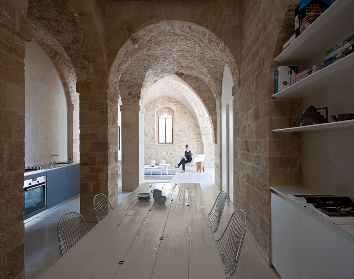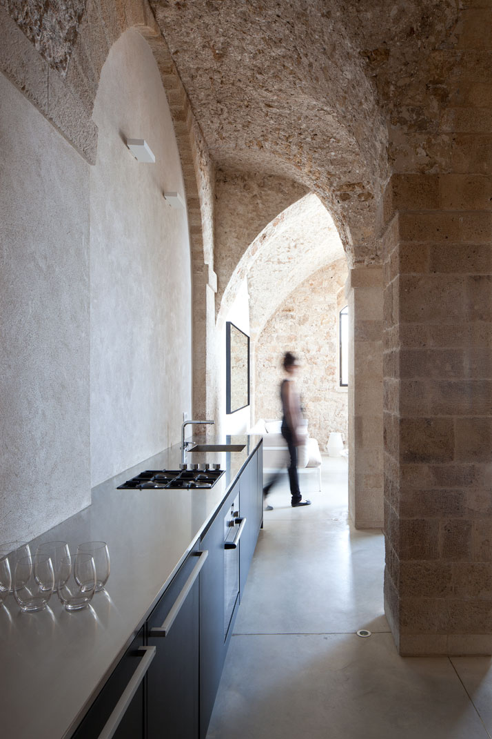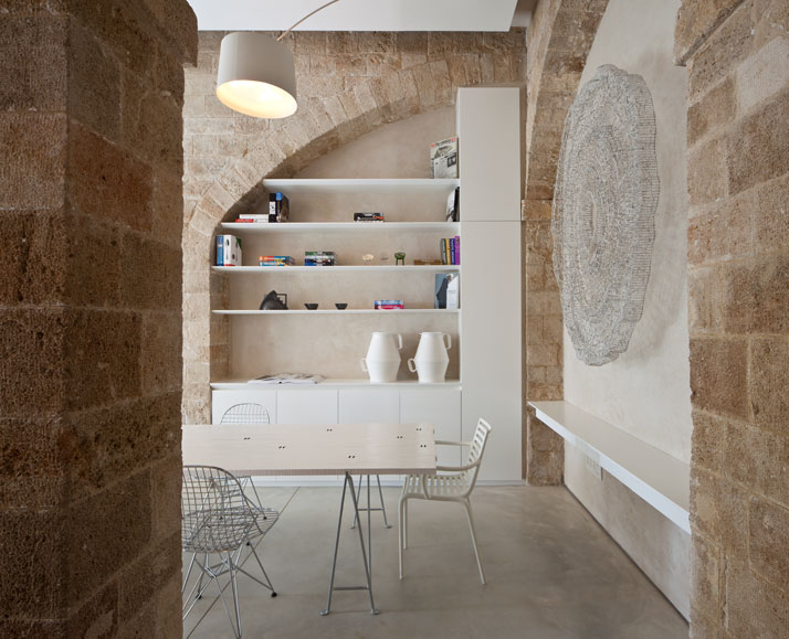 The 100 square meter residential home is located in Old Jaffa. Its location is unique in that it is set above the harbor, facing west with all of its openings facing the majestic splendor of the Mediterranean Sea. Whilst it is difficult to determine the buildings exact age, it is clear that it is hundreds of years old. Over the years, it has undergone many changes and had many additions made that have damaged the original quality of the building and its spaces. The central idea was to restore the structure’s original, characteristics, the stone walls, the segmented ceilings and the arches including the exposure of the original materials (a combination of pottery and beach sand). The building has been cleaned of all of the extraneous elements, from newer wall coverings and has undergone a peeling process to expose its original state. Surprisingly, modern, minimalistic construction styles remind us of and correspond with the ascetic style of the past, and this despite the vast time difference between them. The central idea was to combine the old and the new whilst maintaining the qualities of each and to create new spaces that blend the styles together even intensify them because of the contrast and tension between the different periods. The historical is expressed by preserving the textures and materials of the buildings outer shell and by respecting the building engineering accord. The modern is expressed by the opening of spaces and by altering the internal flow to one more open and free and the creation of an urban loft environment along with the use of stainless steel, iron and Korean in the various partitions, in the openings and in the furniture. The project succeeds in both honoring and preserving the historical and almost romantic values of the structure whilst creating a contemporary project, modern and suited to its period. Despite the time differences, the tensions and the dichotomy between the periods exist in a surprisingly balanced and harmonic space.