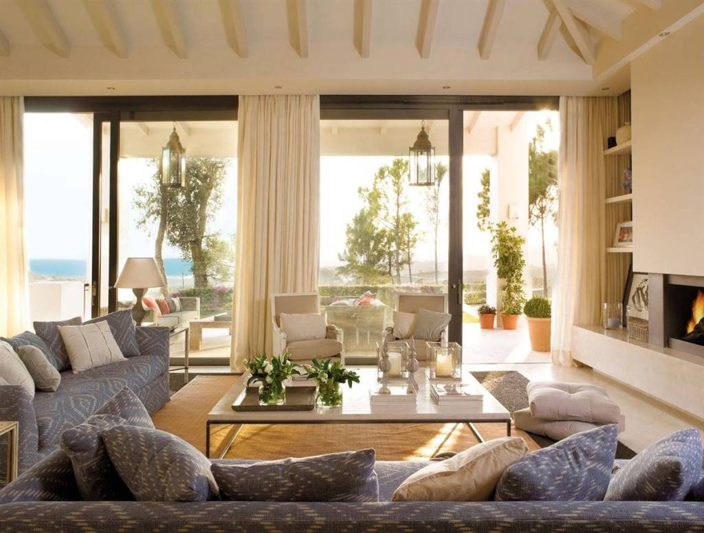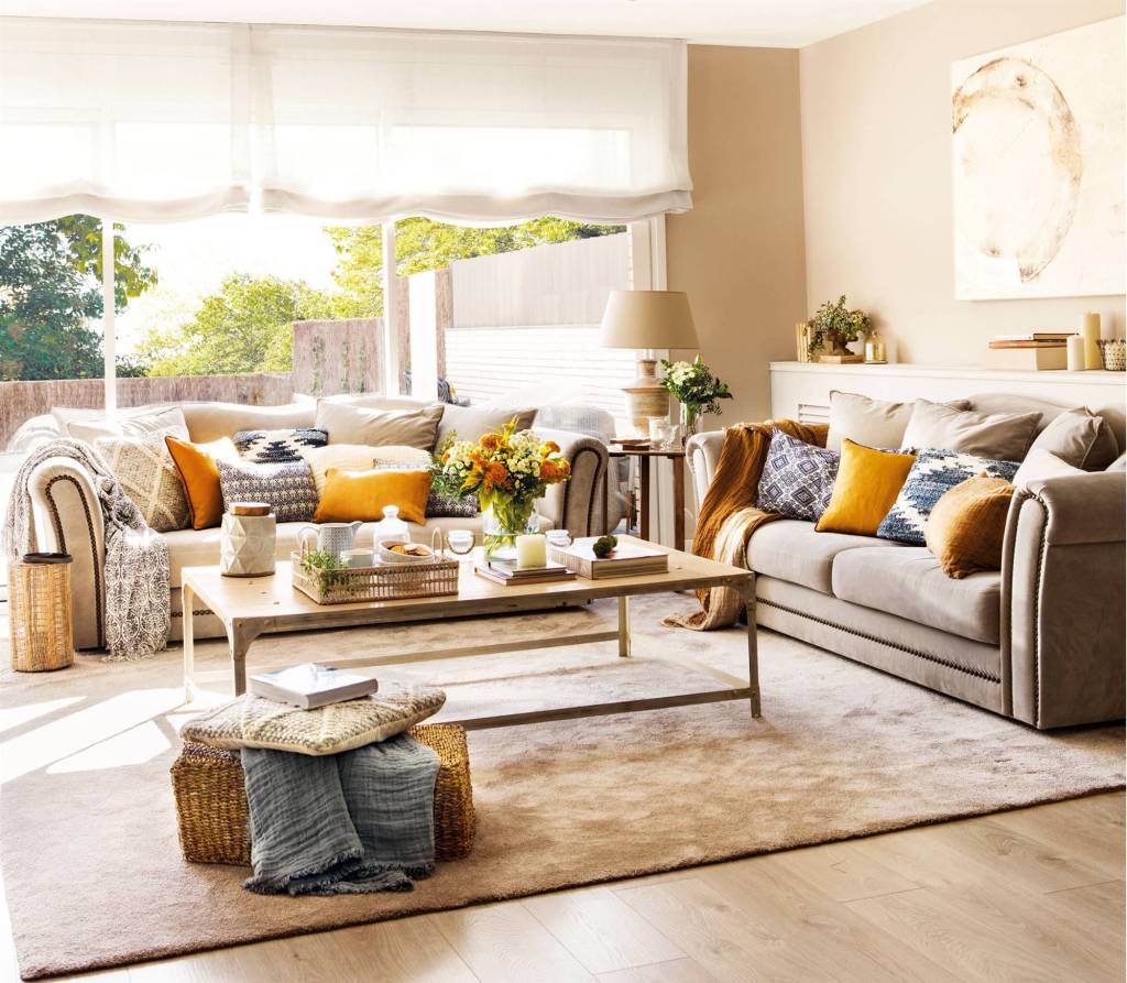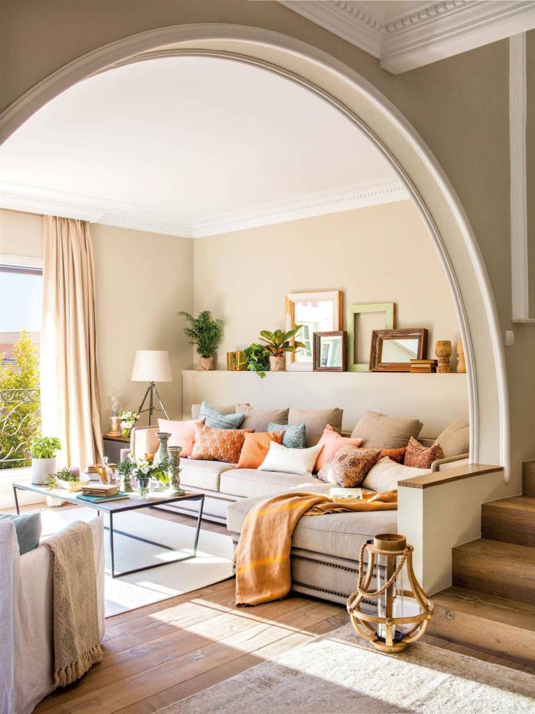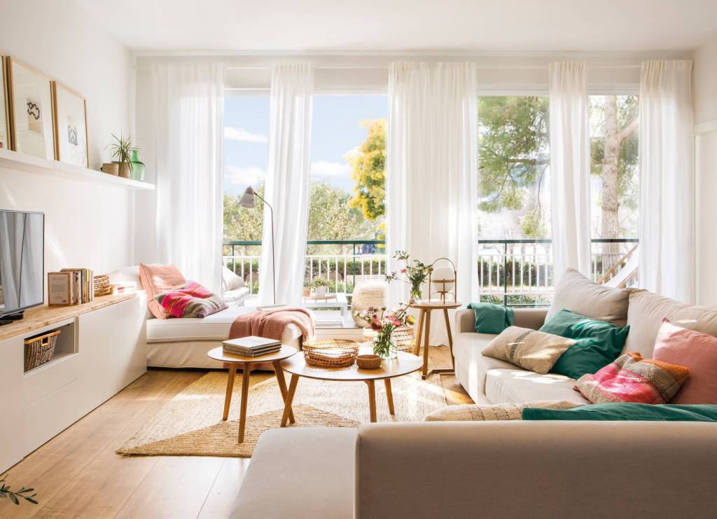 Las cortinas y los cojines son muy importantes para darle un toque de calidez. Intenta no recargar y opta por telas unicolor y de caida suave y vaporosa…harán que tu salón se sienta ligero y fresco, a la vez que le dará esa calidez que siempre buscamos.