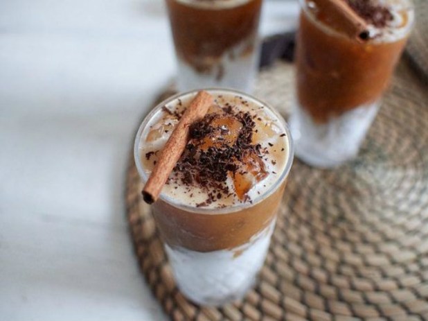 Servir en un vaso alto y decorar por encima con crema chantilly, chocolate rallado, sirope de caramelo, fresas, canela o lo que más te guste.