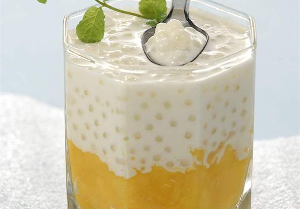 - Al servir repartir trocitos de mango en 4 vasos o cuencos de cristal y verter por encima leche de coco con tapioca. Decorar con hojas de menta.