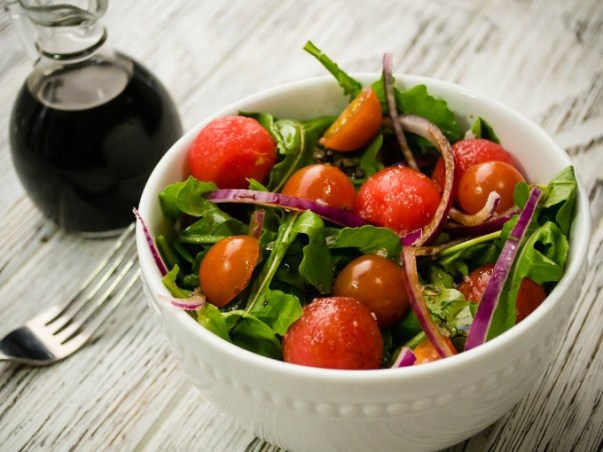 En otro tazón, mezcla el vinagre, sal y aceite de oliva. Una vez que se vaya a comer la ensalada, incorpora el aderezo.