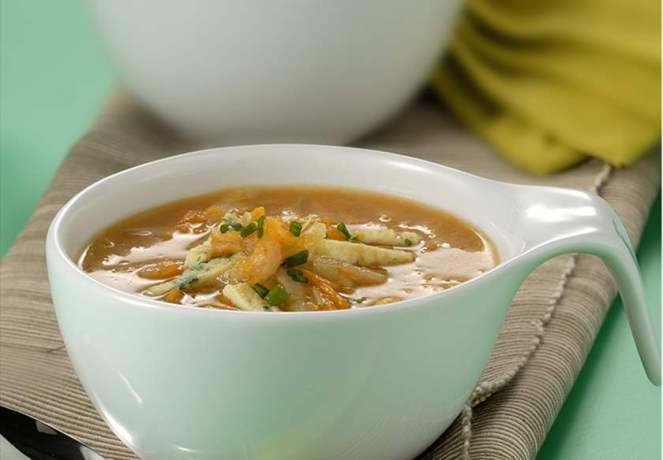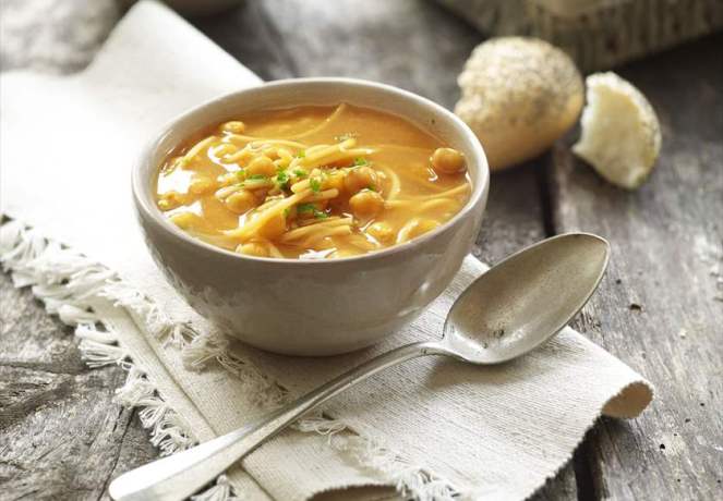 - Cocer una tortilla plana, cortar en tiritas y añadir a la sopa al servir.