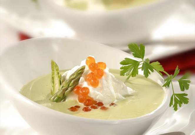 - Repartir la crema bien fría en 4 cuencos. Añadir 1/2 punta de espárrago laminada, una cucharada de nata, unas huevas de salmón y una ramita de perejil.