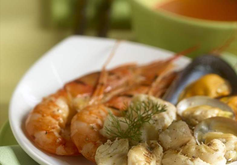 - Sazonar rape y gambas con sal y pimienta y preparar a la plancha con un poco de aceite.